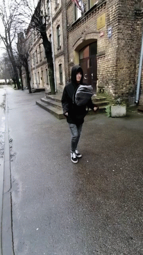 Контентын тайлбар: a person carrying a baby in a sling walks down a street