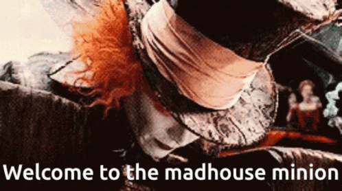 Контентын тайлбар: a welcome to the madhouse minion sign with a mad hatter