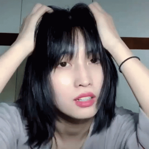 Контентын тайлбар: a young woman with short black hair is holding her hair in her hands .