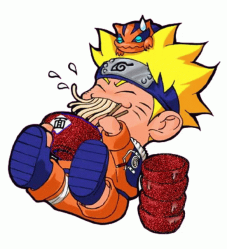 Контентын тайлбар: a cartoon of naruto eating noodles with a cat on his head and a stack of bowls .
