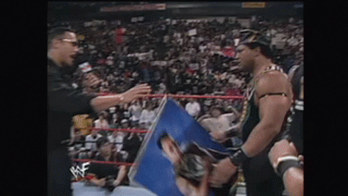 Контентын тайлбар: a man in a wrestling ring is talking to another man while holding a sign that says wwe