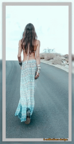 Контентын тайлбар: a woman in a blue and white dress is walking down a road with a border that says b-collections design