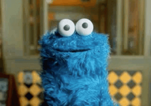 Контентын тайлбар: cookie monster from sesame street is smiling and looking at the camera with big white eyes .
