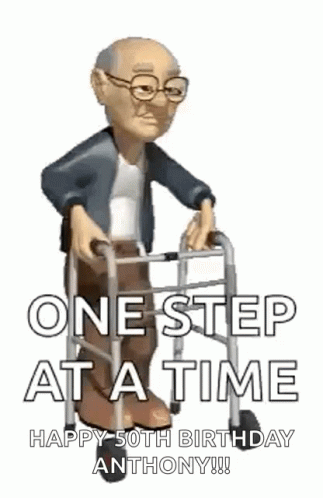 Контентын тайлбар: an elderly man is using a walker to walk and says `` one step at a time '' .