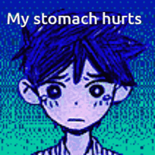 Контентын тайлбар: a pixel art of a boy with blue hair and the words `` my stomach hurts '' written on it .