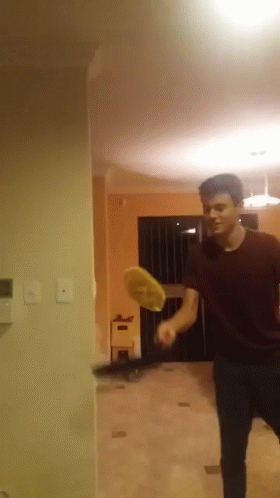 Контентын тайлбар: a man in a black shirt is throwing a frisbee in a room
