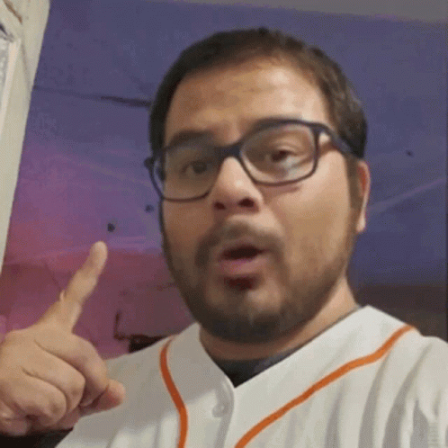 Контентын тайлбар: a man with glasses and a beard is wearing a baseball jersey and pointing at the camera .