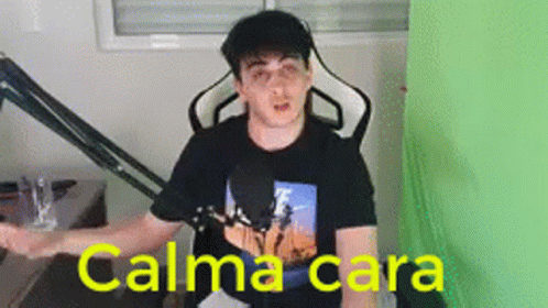 Контентын тайлбар: a man in a black shirt is sitting in front of a green screen with the words calma cara on it .