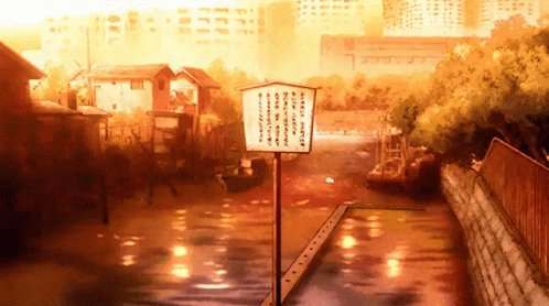 Контентын тайлбар: a painting of a river with a sign in the foreground that says ' tokyo ' on it