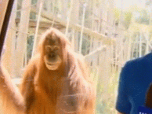 Контентын тайлбар: a orangutan is standing in front of a glass door .