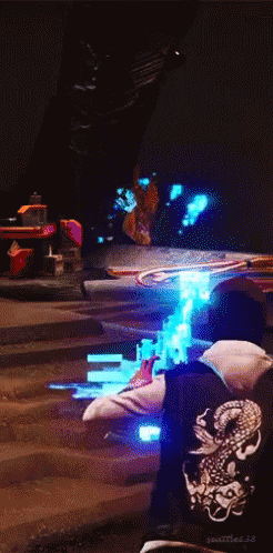 Контентын тайлбар: a person with a dragon on their back sits in front of a blue light