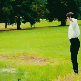 Контентын тайлбар: a man in a white shirt and black pants stands in the grass near a body of water