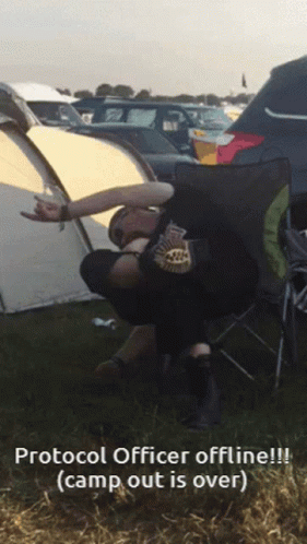 Контентын тайлбар: a man sits in a chair in front of a tent with the words protocol officer offline