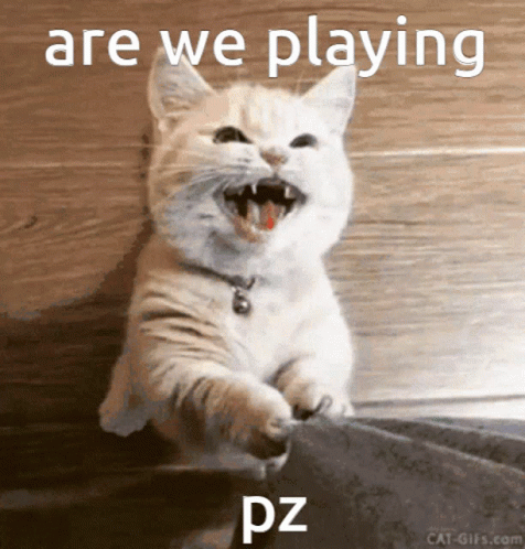 Контентын тайлбар: a white cat with its mouth open and the words are we playing pz