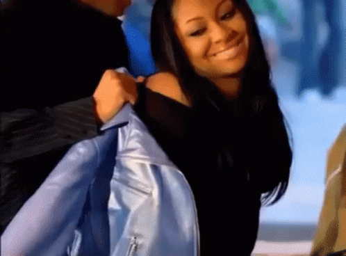 Контентын тайлбар: a woman is wearing a blue jacket and smiling while a man holds her jacket .