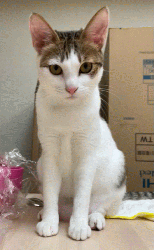 Контентын тайлбар: a brown and white cat is sitting in front of a box that says tw