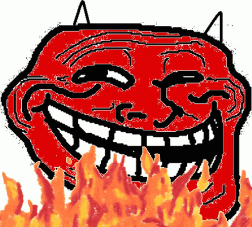 Контентын тайлбар: a red troll face is smiling in front of a fire