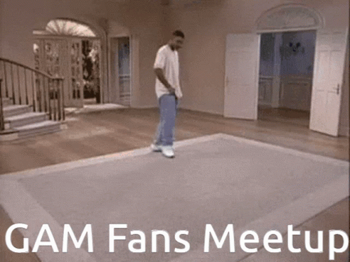 Контентын тайлбар: a man standing on a rug in a room with the words gam fans meetup