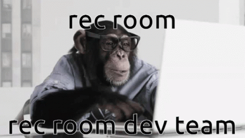 - Контентын тайлбар: a chimpanzee wearing glasses sits in front of a laptop with the words rec room dev team written on the bottom