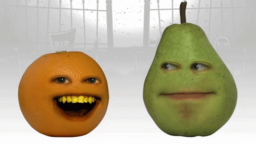 Контентын тайлбар: an orange and a pear are standing next to each other in front of a sign that says rip