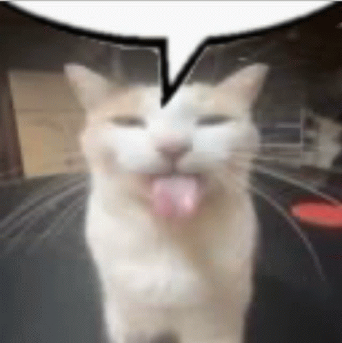 Контентын тайлбар: a close up of a cat with its tongue hanging out and a speech bubble above it .