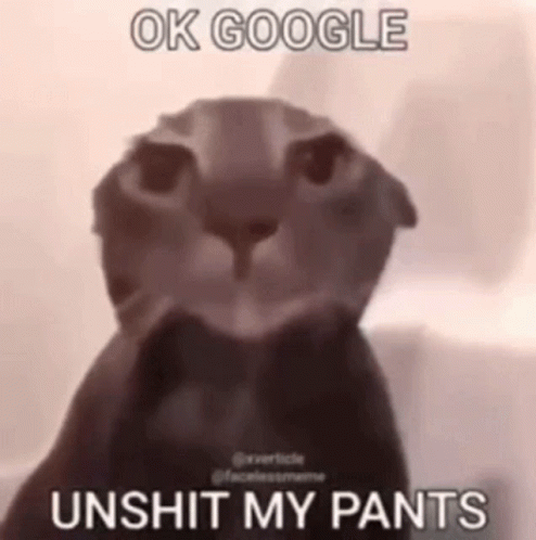 - Контентын тайлбар: a cat is looking at the camera with the words `` ok google unshit my pants '' written above it .