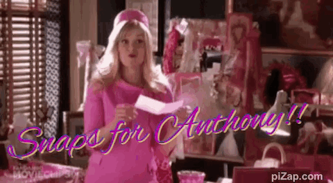 Контентын тайлбар: a woman in a pink dress is holding a piece of paper and says snaps for anthony .
