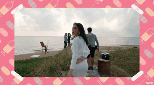 Контентын тайлбар: a woman in a white dress is standing on a beach in front of a pink background with syringes and pills