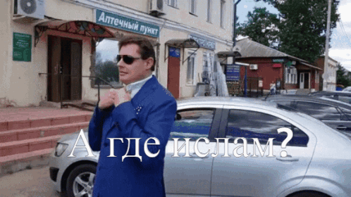 Контентын тайлбар: a man in a blue suit stands in front of a building with a sign that says " аптечный пункт "
