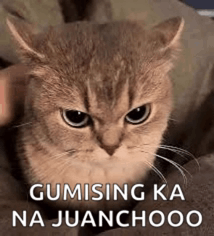 a close up of a cat with the words gumising ka na juanchooo on the bottom
