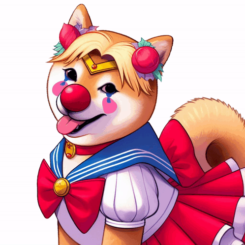 a cartoon dog wearing a clown hat and a red nose with the words idoge coma below it