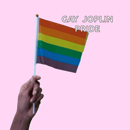 a hand holding a small rainbow flag with the words gay joplin pride written above it