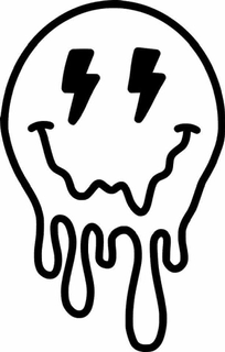 a black and white drawing of a melting smiley face with lightning bolts on its face .