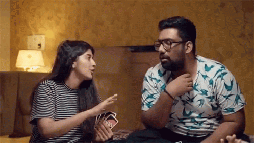 a man and a woman are sitting on a bed playing a game of uno cards .