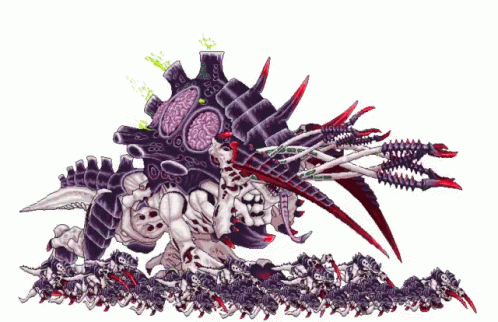 Descrierea conținutului: a drawing of a giant monster with a bunch of smaller monsters around it