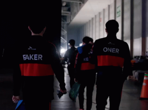 Descrierea conținutului: a group of people are walking down a hallway and one of their jackets says faker