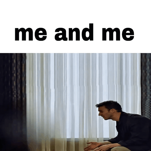 Descrierea conținutului: a man sits in front of a window with the words " me and me " above him