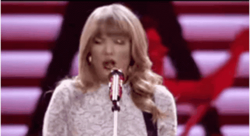 Descrierea conținutului: taylor swift is singing into a microphone on stage .