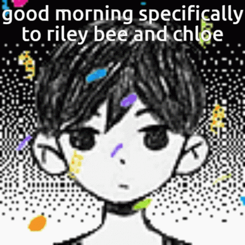 - Descrierea conținutului: a black and white drawing of a boy with the words `` good morning specifically to riley bee and chloe '' .