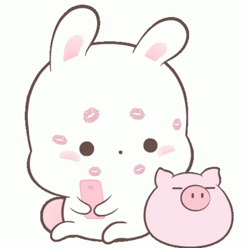 Descrierea conținutului: a cartoon rabbit is sitting next to a pink pig and has kisses on its face