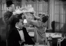 Descrierea conținutului: a black and white photo of a woman holding a cake over a man 's head in a restaurant .