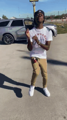 Descrierea conținutului: a man standing in front of a silver suv wearing a white t-shirt that says n.h.o.