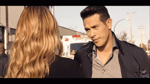 Descrierea conținutului: a man and a woman are talking in front of an ambulance with the letter e on the bottom