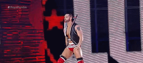Descrierea conținutului: a wrestler is standing on a stage holding a sword .