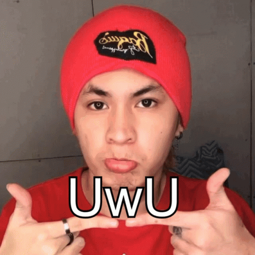 Descrierea conținutului: a man wearing a red beanie and a red shirt has the word uwu written on his face
