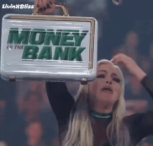 Descrierea conținutului: a woman is holding a briefcase with the words money in the bank on it