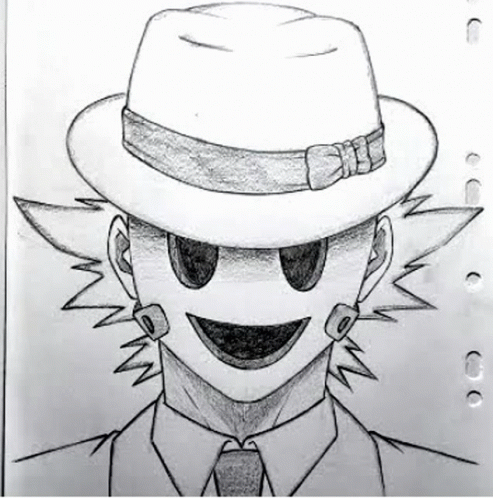 Descrierea conținutului: a black and white drawing of a man wearing a hat and tie with a smile on his face .