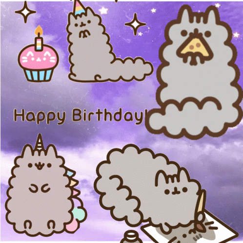 Descrierea conținutului: a happy birthday greeting card with a cat and a cloud