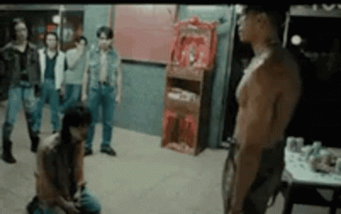 Descrierea conținutului: a man without a shirt is kneeling down in front of a group of people .