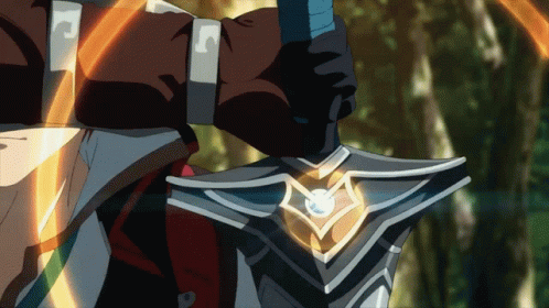 Descrierea conținutului: a man holding a sword with a shield on it